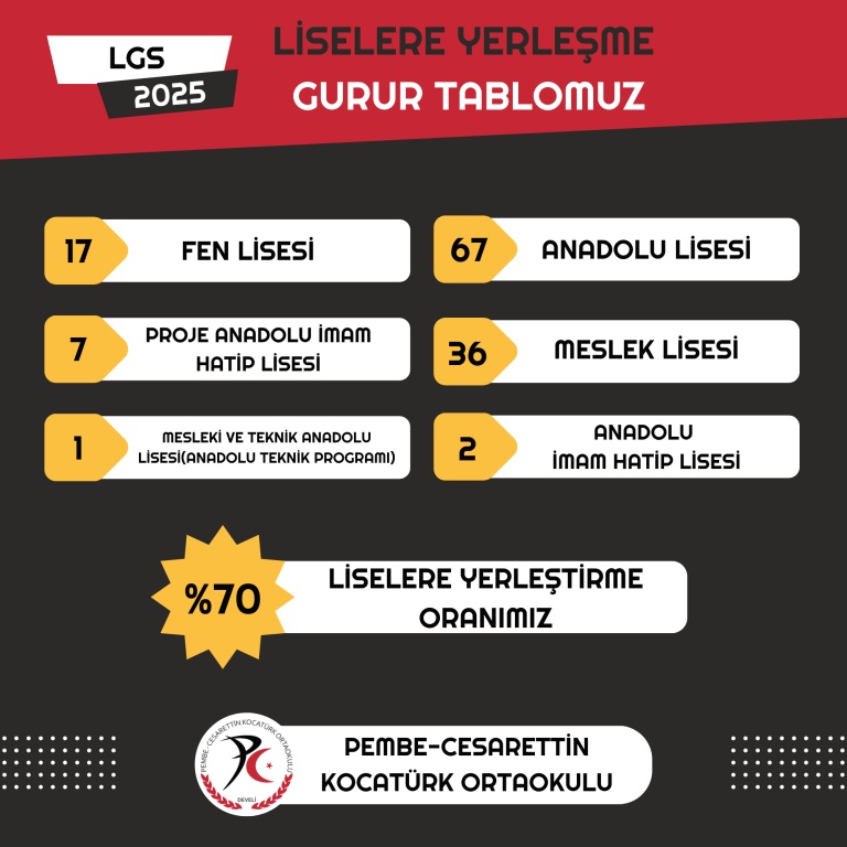 Okulumuzun göstermiş olduğu bu başarıda emeği geçen öğretmen, öğrenci ve velilerimize teşekkür eder, mezun olan öğrencilerimize yeni okullarında başarılar dileriz.